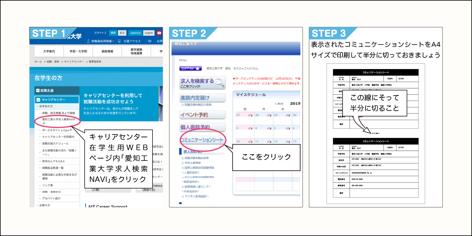 愛知工業大学求人検索ナビから以下の手順にそって印刷してください。システムの仕様上、進路希望登録を済ませていないとコミュニケーションシートは印刷できません。なお、印刷内容を変更するには進路希望登録時の情報を変更する必要があります。その他、印刷方法(手順)について不明なことがあれば、キャリアセンターに来てください。